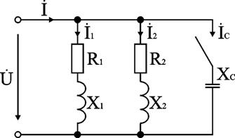 Ток в цепи источника I = S / U = 1068 / 220 = 4,85 А. Коэффициент мощности схемы cos φ = P / S = 700 / 1068 = 0,655. 4. Рассчитаем емкость конденсатора, необходимую для повышения коэффициента мощности схемы до cos φ' = 0,9. Включение конденсатора параллельно нагрузке не изменяет ее активную мощность, а уменьшает реактивную и полную мощности, потребляемые всей схемой от источника. Поэтому по активной мощности цепи и заданному значению cos φ' определим полную мощность цепи S' = P / cos φ' = 700 / 0,9 = 777,8 ВА. Реактивная мощность цепи