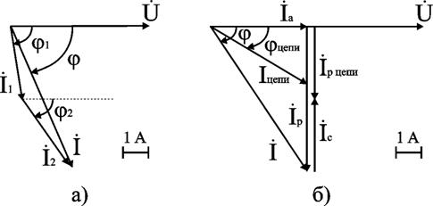 Ток в цепи конденсатора и его сопротивление: IC = QC / U = 467 / 220 = 2,12 А; XC = U / IC = 220 / 2,12 = 103 Ом. Емкость конденсатора C = 1 / (2πf XC) = 1 / (2π · 50 · 103) = 30,7·10-6 Ф = 30,7 мкФ. Результатирующий ток источника I' = S' / U = 777,8 / 220 = 3,535 А. На рис. 6.13 приведены векторные диаграммы напряжения и токов схемы без конденсатора (а) и после подключения параллельно нагрузке конденсатора (б).