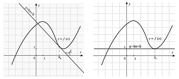 Угол α (альфа) может быть меньше, больше 90 градусов или равен нулю. Проиллюстрируем, два случая: 1. Угол наклона касательной больше 90 градусов (тупой угол). 2. Угол наклона касательной равен нулю градусов (касательная параллельна оси ох).