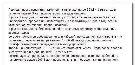Периодичность испытаний кабелей