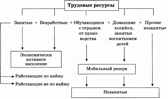 Что касается лиц, занимающихся домашним хозяйством и уходом за детьми, а также обучающихся с отрывом от производства, то они составляют мобильный резерв трудовых ресурсов. Состав трудовых ресурсов представлен на рис. 1. Наряду с понятием трудовых ресурсов в последнее время широко используется понятие экономически активного населения. Данная категория точнее отражает реалии современной рыночной экономики. Экономически активное население – это часть населения, осуществляющая предложение рабочей силы на рынке труда, количество которой рассчитывается как сумма численности фактически занятых и безработных. Таким образом, экономически активное население меньше трудоспособного населения на величину той его части, которая не желает участвовать в общественном производстве (т.е. экономически неактивного населения) [1].