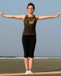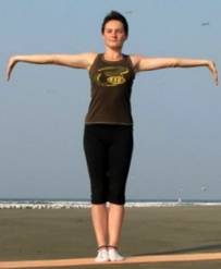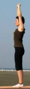 9. Поднимаемся (повторение 1), ноги на ширине плеч, руки опущены. На вдохе поднимаем руки вверх и опускаем на выдохе. Ещё 2 раза.