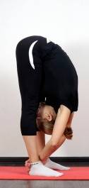 2. На выдохе плавно наклоняемся вперёд, колени не сгибаем, и так же плавно поднимаемся на вдохе. Ещё 2 раза.