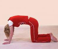 5. Становимся на четвереньки. Ладони ставим под плечами. Пальцы рук направлены вперёд, носки вытянуты. Колени расположены под прямым углом к туловищу. На вдохе выгибаем дугой спину, подбородок прижимаем к груди. Голова и шея расслаблены. На выдохе становимся в исходное положение. (Повторяем 4 раза).