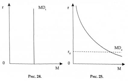 Графік попиту на гроші для операцій МБ(має вигляд вертикальної прямої (рис. 24), оскільки він залежить не від ставки процента за не грошовими активами, а від номінального ВНП. Попит на гроші з боку активів МDа (рис. 25) обернено пропорційний ставці процента. Загальний попит на гроші МD (рис. 26) зсуває по горизонтальній осі криву попиту на гроші з боку активів на величину, яка дорівнює попиту на гроші для операцій. При цьому ставка процента не повинна опускатися нижче деякого мінімально припустимого значення г0, інакше власник заощаджень віддасть перевагу збереженню своїх доходів у формі готівки. Деякі зарубіжні економісти не визнають відокремлення попиту на гроші для операцій від попиту на гроші з боку активів, у. Баумоль і Дж. Тобін, зокрема, вважають, що індивід, маючи певну кількість грошей для оперативних