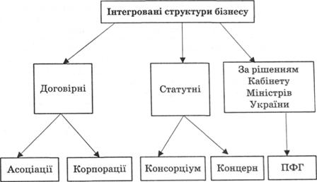 Асоціації набули значного поширення в розвинутих країнах. У США їх налічується не менше 80 тис. Сім з десяти американців є членами принаймні однієї асоціації. Найпоширеніший вид асоціацій – галузеві. Функціонують також асоціації, що поєднують промисловців суміжних галузей, а також міжгалузеві асоціації. Асоціації створюються за безліччю інших принципів. Наприклад, асоціація дрібних і середніх підприємців, дилерів, лізингових компаній, якості, промислових кооперативів, наукових парків та ін. Членами асоціацій можуть бути як фізичні, так і юридичні особи. Найбільшими асоціаціями в США, у яких беруть активну участь американські радіоелектронні фірми, є: Асоціація радіоелектронної промисловості (Electronic Industry Association, ЕІА), Американська радіоелектронна асоціація (American Electronic Association, АЕА). Обидві вони займаються в основному лобістською діяльністю, спрямованою на захист інтересів компаній – членів асоціацій у законодавчих, виконавчих і судових органах. Асоціацією в Україні є "Київбудматеріали", яка включає такі підприємства: ВАТ "Будматеріали" (м. Біла Церква), КП "Переяслав-Хмельницький цегляний завод". Корпоративною формою об'єднання підприємств в Україні є "Rainford", основні напрями діяльності якого – виробництво хліба, молочних продуктів, ковбасних виробів, шоколаду, взуття, телевізорів. Консорціуми (або синдикати) утворюють тимчасові банківські об'єднання, що виникли на договірній основі з метою спільної реалізації кредитних, гарантійних та інших банківських операцій та послуг. Особливостями консорціуму можна вважати такі: – тимчасова угода учасників на договірній основі для здійснення яких-небудь проектів у різних сферах виробничо-господарської та фінансової діяльності; – консорціум може створюватися як без утворення, так і з утворенням юридичної особи; – юридично й економічно його учасники самостійні, крім діяльності, пов'язаної з досягненням загальних цілей; – він часто є безприбутковою організацією; – як правило, немає спеціально створеної організаційної структури управління учасниками. На сьогодні у світовій практиці найчастіше зустрічаються консорціуми фінансового типу. Концерни діють у галузях, де розвинене велике і масове виробництво, застосовуються високі технології. Найчастіше це чорна і кольорова металургія, машинобудування й автомобілебудування, хімічна й електротехнічна промисловість. Діяльність концерну може поширюватися як на певну підгалузь, так і на цілу галузь економіки. До нього можуть також належати підприємства однієї або декількох галузей. Однак лише деякі найбільші концерни цілком охоплюють галузь економіки. Прикладом промислового концерну є група японських підприємств, що входять в інтегровану структуру бізнесу "Тойота". ФПГ можна ідентифікувати практично з усіма інтегрованими структурами, які нині поширені. До особливостей ФПГ належать такі: – над фірмове утворення, яке об'єднує учасників з різних сфер діяльності: фінансової, виробничої, торговельної та науково-дослідної; – до складу ФПГ можуть входити цілі концерни, конгломерати, окремі корпорації, а також обов'язково фінансово-кредитні установи; – організаційна структура буває як ієрархічною, так і такою, де учасники номінально можуть залишатися самостійними юридичними особами; – централізоване управління у сфері фінансів і ст