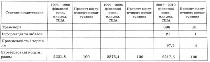 новою Кабінету Міністрів України) проекти поділяються на системні та інвестиційні. На сьогодні в активній стадії впровадження перебувають 9 інвестиційних проектів, сума позик за якими становить 1300,35 млн дол. США, та 3 системні на 153,51 млн дол. США. Системні проекти - проекти, які спрямовані на здійснення економічної реформи в Україні, у тому числі на реформування державного сектору, структурні та інституційні зміни у галузях і секторах економіки. При цьому фінансові ресурси, надані міжнародними фінансовими організаціями для системних проектів, використовуються виключно для підтримки платіжного балансу та фінансування дефіциту державного бюджету і повертаються за рахунок коштів останнього. Інвестиційні проекти - проекти розвитку окремих галузей та секторів економіки, виробництв, фінансування яких здійснюється на умовах самоокупності та обов'язкового внутрішнього співфінансування. Найбільша частина кредитних ресурсів була надана на проекти, які стосувалися управління фінансовим сектором (33 %). Важливими також були питання управління державним сектором, розвиток енергетики, гірничої справи та транспорт (табл. 11.10), на які припадало відповідно 19,19 і 18 % сукупного кредитування. Домінування енергетичного сектору поступово зменшувалося, натомість великі ресурси були спрямо- Таблиця 11.10. Структура кредитування МБРР в Україні