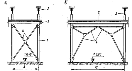Рис. 58. Вертикальные связи между колоннами: а — крестовые; б — портальные; 1 —железобетонные колонны; 2 — подкрановые балки; 3 — балки (или фермы) покрытия; 4 — вертикальные связи Кроме вертикальных связей между колоннами устанавливают также горизонтальные и вертикальные связи между фермами (балками) покрытия. Гори-, онтальные связи устанавливаются в горизонтальных плоскостях, е. в плоскостях верхнего и нижнего поясов ферм, вертикальные — в вертикальных плоскостях между фермами. Каркасы многоэтажных зданий бывают рамного, связевого и рамно-связевого типа. Для зданий из сборных железобетонных элементов чаще применяют каркасы рамно-связевой системы (рис. 59).