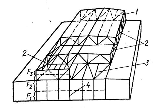 Ветровое давление, передающееся на деревянную торцовую стену каркасной конструкции небольшой высоты, распределяется между фундаментом и верхним покрытием с помощью работающих на изгиб вертикальных стоек каркаса. Конструкция покрытия в этом случае должна передавать ветровое давление через верхнюю обвязку продольным стенам, которые, в свою очередь, должны иметь в своей плоскости связи, рассчитанные на передачу этих усилий фундаментам. При устройстве в качестве основы под рубероидную кровлю щитового перекрестного настила покрытие превращается в неизменяемую и жесткую диафрагму. В этом случае расчет сводится к проверке прочности: а) прикрепления верхних концов стоек каркасной стены к прогонам на передачу ветрового давления; б) гвоздевой пришивки прогонов к щитовому настилу, скрепленному диагональными элементами; в) соединения гвоздями обоих щитовых настилов для перекрытия их стыков, расположенных вразбежку; г) прикрепления настила, связанного с диагональными элементами, к верхней обвязке каркасных деревянных стен. Указанное решение покрытия обеспечивает хорошее закрепление плоских деревянных конструкций в проектном положении. Жесткость покрытий с одинарным настилом или с обрешеткой без диагональных элементов недостаточна для восприятия ветровой нагрузки и закрепления плоскостных деревянных конструкций в проектном положении. В этом случае при наличии деревянных каркасных стен необходимо устройство в плоскости верхних поясов несущих конструкций горизонтальных связей, располагаемых в торцовых частях здания и по его длине на расстоянии не более 20 м (рис. 1). Для покрытия, выполненного из разрезных кровельных панелей, жестких и неизменяемых в своей плоскости, требуется установка монтажных связей, которые прикрепляют непосредственно к основной несущей конструкции (рис. 1, б). Горизонтальные связи, воспринимающие ветровую нагрузку, образуют в плоскости верхних поясов двух соседних несущих конструкций решетчатую ферму, которая передает действующие в ее плоскости усилия на продольные стены. При жестких торцовых стенах, воспринимающих ветровую нагрузку, и небольшой длине здания (до 20 м) устойчивость плоских деревянных конструкций может быть создана прогонами кровли, надежно скрепленными с верхним поясом фермы и заанкеренными своими концами в торцовые каменные стены (рис. 2). При этом стыки разрезных или консольно-балочных прогонов должны быть перекрыты накладками на гвоздях. В средней части зданий большой протяженности, кроме того, устраивают горизонтальные связи (см. рис. 1) на расстоянии около 20 м от торцовой стены и. одни от других. На рис. 3 показана пространственная схема здания с покрытием по пятиугольным фермам; в торце здания сделан проем для ворот. Ветровую нагрузку, приходящуюся на площадь F1, воспринимают нижние опорные устройства раздвижных ворот. Давление на площадь F3 передается через прогоны бесчердачному покрытию, а давление на площадь F2 воспринимается специальной горизонтальной надворотной фермой, подвешенной к основным фермам на уровне затяжек и передающей ветровую нагрузку продольным стенам здания. Кровельное покрытие, воспринимающее давление ветра с площади F3, не примыкает непосредственно к настенному брусу. Для передачи этого ветрового давления на настенный брус в панелях фонаря должны