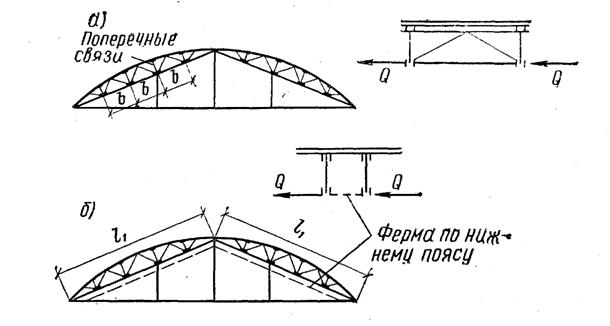 При раскреплении нижних поясов ферм арочной конструкции попарно поперечными связями (рис. 6, а) последние воспринимают, таким образом, горизонтальные силы Q от двух смежных поясов и передают их в плоскости верхних поясов или на жесткую систему кровельного покрытия, образуемую щитовым настилом, либо на ветровые фермы или специальные связи. Близко расположенные друг от друга арочные или рамные конструкции иногда соединяют попарно решетчатыми связями, располагаемыми в плоскости нижних сжатых поясов (рис. 6, б). Такие связи рассчитывают как горизонтальные фермы, имеющие пролет, равный длине нижнего пояса полуарки. Такое решение связей менее рационально. При этом связи по верхнему поясу должны быть рассчитаны на восприятие не только горизонтальных сил от закрепляемых узлов верхнего пояса, но и от реактивных сил в верхнем шарнире и от горизонтальных ферм по нижнему поясу. Если к одной системе связей прикреплены сжатые контуры нескольких плоских конструкций, то усилия, передающиеся на узлы связей, принимают равными nQ {п - количество раскрепляемых конструкций). Бывают случаи, когда даже при отсутствии активных сил, действующих перпендикулярно плоскости конструкции, приходится принимать меры к пространственному креплению ее растянутого контура. Примером таких конструкций являются шпренгельные системы (рис. 7).