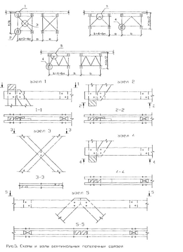 Рассмотренные ранее пространственные крепления. воспринимающие ветровые усилия, в то же время служат для предупреждения выпучивания сжатого контура плоскостных деревянных конструкций. В большинстве случаев сжатый пояс в них раскрепляют прогонами кровли, которые должны быть прочно прикреплены к верхнему поясу, и настилам кровли. В арочных конструкциях помимо верхних (сжатых) поясов следует раскреплять и нижние сжатые пояса арок, а в некоторых рамных конструкциях - внутренний контур рамы, который может быть сжат на всей своей длине или на части ее, особенно при несимметричном приложении нагрузок. Нижние пояса раскрепляют (при пространственно устойчивом верхнем покрытии) устройством вертикальных связей. Учитывая деформации в соединениях связей, за расчетную длину сжатого нижнего пояса при проверке его устойчивости следует принимать расстояние между связями, увеличенное на 25 %. Основным типом поперечных вертикальных связей являются жесткие связи, соединяющие попарно вдоль здания соседние конструкции (рис. 5). Вертикальные связи не следует делать непрерывными по всей длине здания, так как при обрушении по какой-либо причине одной из несущих конструкций она перегрузит через связи соседние конструкции, что может привести к последовательному обрушению всего покрытия.