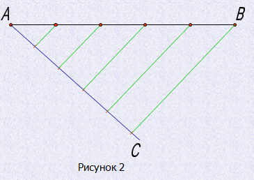 Если отрезок, например отрезок АВ (рис.2), необходимо разделить на несколько равных частей, то из точки А проводим вспомогательную прямую АС под острым углом. От вершины образовавшегося угла (в данном случае от точки А) на вспомогательной прямой откладывают столько одинаковых отрезков произвольной длины, на сколько частей нужно разделить отрезок АВ. Конец последнего отрезка прямой линией соединяют с точкой В и параллельно этой линии через все деления проводят прямые до пересечения с прямой АВ, деля ее тем самым на заданное число равных отрезков.