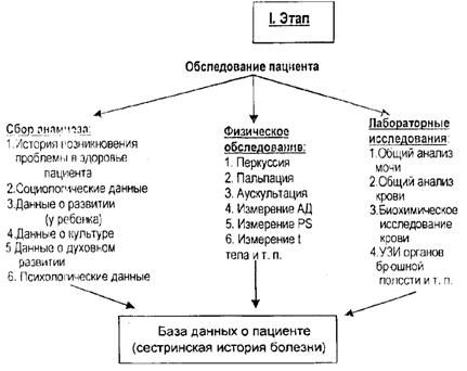 Первый этап: обследование пациента — текущий процесс сбора и оформления данных о состоянии здоровья пациента. Цель - собрать, обосновать и взаимосвязать полученную информацию о пациенте для того, чтобы создать информационную базу данных о нем, о его состоянии в момент обращения за помощью. Главная роль в обследовании принадлежит расспросу.Источником информации может быть не только пострадавший, но и члены его семьи, коллеги по работе, друзья, случайные прохожие и т. д. Они дают информацию и в том случае, когда пострадавшим является ребенок, душевнобольной, человек в бессознательном состоянии и т.п.