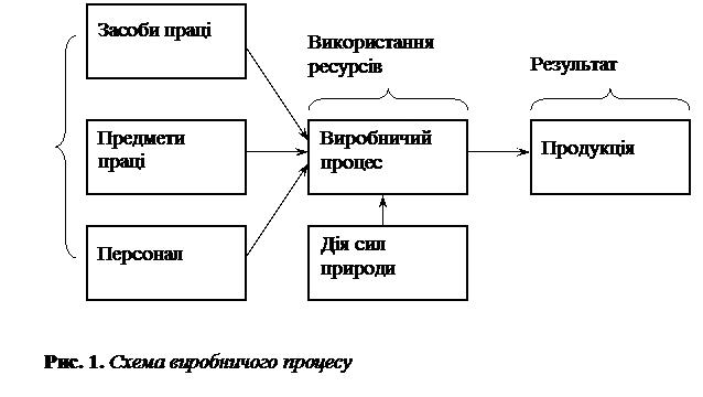 Виробничий процес — це сукупність взаємозв'язаних дій людей, засобів праці та природи, потрібних для виготовлення продукції. Основними елементами виробничого процесу є процес праці як свідома діяльність людини, предмети та засоби праці (рис. 1).