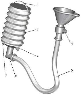 1- ручка; 2 – гофрированиий міх; 3 – нереверсивний клапан; 4 – запобіжний клапан тиску; 5 – гофрирований шланг; 6 – кутник; 7 – клапан забору повітря.