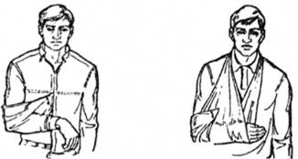 При переломі або вивиху плечової кістки шини варто накладати на зігнуту в ліктьовому суглобі руку. При ушкодженні верхньої частини кістки шина повинна охоплювати два суглоби - плечовий і ліктьовий, а при переломах нижньої частини - і променевий зап'ясток (рис. 8.10). Шини необхідно прибинтовувати до руки, руку підвісити на косинці або бинті до шиї.