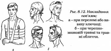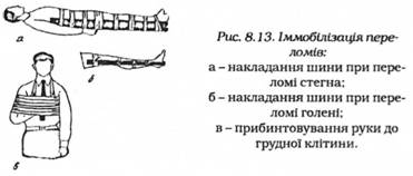При переломі кісток таза відчувається біль при обмацуванні таза, біль у паху, в зоні хребця, неможливо підняти випрямлену ногу. У таких випадках рекомендується підсунути під спину потерпілого широку дошку, покласти його в положення "жаба", тобто зігнути його ноги в колінах I розвести в сторони, а стопи покласти разом, під коліна підкласти валик з одягу. Не можна повертати потерпілого на бік, саджати І ставити на ноги (щоб уникнути ушкодження внутрішніх органів). При травмі голови (рис. 8.12. б) можливий перелом черепа (ознаки: кровотеча з вух і рота, несвідомий стан) або струс мозку (головний біль, нудота, блювота, втрата свідомості).