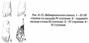 Пошкодження тканин у результаті впливу низьких температур називається обмороженням. При цьому відбувається пригнічення життєвих процесів у тканинах, а не їх загибель. Обмороження І,ІІ, III ступенів показано на рис. 8.15. Чим нижче температура тканин, тим більше порушуються обмінні процеси, що визначають життєдіяльність організму (при температурі 10°С припиняється кровоток). Згасання обмінних процесів знижує потреби тканин, але не веде до їх ушкодження. Загибель переохолоджених тканин настає при нерівномірному їх зігріванні.