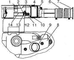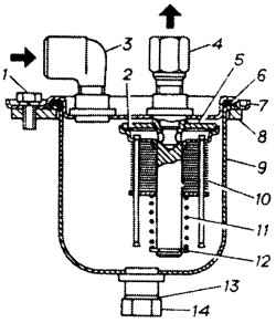 Топливный фильтр-отстойник (рис. 4.27) установлен на левом лонжероне рамы перед топливным баком и предназначен для отделения от топлива воды и механических примесей размером более 0,05 мм. Для слива отстоя внизу корпуса фильтра имеется сливная пробка. Для очистки от механических примесей фильтр снабжен фильтрующим элементом, состоящим из набора металлических пластин.