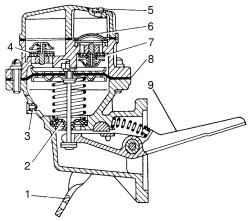 Топливный насос Б-9В (рис. 4.26) — диафрагменного типа, приводится в действие от эксцентрика, расположенного на распределительном валу двигателя. Топливный насос состоит из сборных узлов корпуса с диафрагмой 8 и рычагом привода 9, головки с клапанами 4 и 7 и крышки. Диафрагма из четырех лепестков, изготовленных из лакоткани, зажимается между корпусом и головкой насоса. Тяга диафрагмы уплотняется резиновым уплотнителем 2. Клапан состоит из обоймы, изготавливаемой из цинкового сплава, резинового клапана и латунной шастаны, поджимаемых пружинной (из бронзовой проволоки). Над всасывающими клапанами насоса устанавливается фильтр 6, изготовленный из мелкой латунной сетки. Для заполнения карбюратора топливом при неработающем двигателе насос имеет устройство для ручного привода. Для контроля герметичности диафрагмы в корпусе насоса есть отверстие с сетчатым фильтром 3.