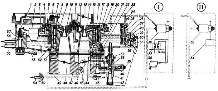 Карбюратор К-151 (рис. 4.29) состоит на трех основных разъемных частей, соединенных через уплотняющие прокладки винтами. Верхняя часть — крышка карбюратора включает воздушный патрубок, разделенный на два канала, с воздушной заслонкой в канале первой камеры. Средняя часть состоит из поплавковой и двух смесительных камер и является корпусом карбюратора. Нижняя часть — корпус дроссельных заслонок включает смесительные патрубки с дроссельными заслонками первой и второй камер карбюратора. Прокладка между средней и нижней частями карбюратора является уплотнительной и теплоизоляционной. Конструктивно карбюратор состоит из двух смесительньных камер — первой и второй. Каждая из камер карбюратора имеет собственную главную дозирующую систему. Система холостого хода — с количественной регулировкой постоянного состава смеси (автономная система холостого хода). Во второй камере карбюратора имеется переходная система с питанием топливом непосредственно из поплавковой камеры, которая вступает в работу в момент открытия дроссельной заслонки второй камеры. Ускорительный насос — диафрагменного типа. Для обогащения горючей смеси при полной нагрузке во второй камере предусмотрен эконостат.