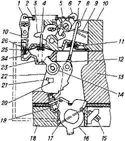 Система пуска холодного двигателя (рис. 4.30) — полуавтоматического типа, состоит из пневмокорректора, системы рычагов и воздушной заслонки, закрытие которой перед пуском холодного двигателя производится водителем при помощи ручного привода. В момент пуска двигателя пневмокорректор, используя разрежение, возникающее под карбюратором, автоматически приоткрывает воздушную заслонку на требуемый угол, обеспечивая устойчивую работу двигателя при прогреве. При вытягивании ручки тяги воздушной заслонки необходимо нажать на педаль акселератора. Система отключения подачи топлива (экономайзер принудительного холостого хода) вступает в работу на режиме принудительного холостого хода при торможении автомобиля двигателем, когда нет необходимости в подаче топлива в двигатель. Тем самым обеспечивается экономия топлива и уменьшается выброс токсичных веществ в атмосферу. Система отключения подачи топлива карбюратора К-151 состоит из блока управления 33 (см. рис. 4.29), микровыключателя 35 электромагнитного клапана 32 и экономайзера принудительного холостого хода. Микровыключатель и экономайзер принудительного холостого хода размещаются на карбюраторе, электромагнитный клапан — блок управления — на щитке передка кабины. Блок управления 33 представляет собой устройство, которое в зависимости от частоты электрических импульсов, поступающих с катушки зажигания, управляет электромагнитным клапаном 32. При отпущенной педали акселератора контакты микровыключателя 35 должны быть разомкнуты. Система отключения подачи топлива работает следующим образом. При отпущенной педали акселератора и частоте вращения коленчатого вала двигателя более 1400 мин-1 блок управления не подает напряжения на электромагнитный клапан, в результате чего через каналы электромагнитного клапана атмосферный воздух поступает в экономайзер принудительного холостого хода, клапан которого перекрывает канал холостого хода. В случае нарушения нормальной работы системы отключения подачи топлива (двигатель не пускается или «глохнет» при отпущенной педали дроссельных заслонок) необходимо прежде всего убедиться в надежности электрических контактов элементов системы, после чего следует последовательно проверить работоспособность электромагнитного клапана, микровыключателя и блока управления. Для проверки электромагнитного клапана и микровыключателя необходимо разъединить электрический разъем блока управления, включить зажигание (двигатель не пускать!) и со стороны моторного отсека одной рукой плавно открыть и закрыть несколько раз дроссельные заслонки карбюратора, а другой — придерживать электромагнитный клапан. При исправном электромагнитном клапане и предохранителе и при исправном и правильно отрегулированном микровыключателе должно ощущаться срабатывание электромагнитного клапана (вибрация, щелчки). Для проверки блока управления необходимо вставить разъем в блок, включить зажигание, пустить двигатель и прогреть его. Затем со стороны моторного отсека одной рукой открыть дроссельные заслонки примерно на 1/3 хода, другой — придерживать электромагнитный клапан. Резко отпустить дроссельные заслонки. При этом, если блок управления исправлен, электромагнитный клапан должен отключиться, а при снижении частоты вращения коленчатого вала примерно д