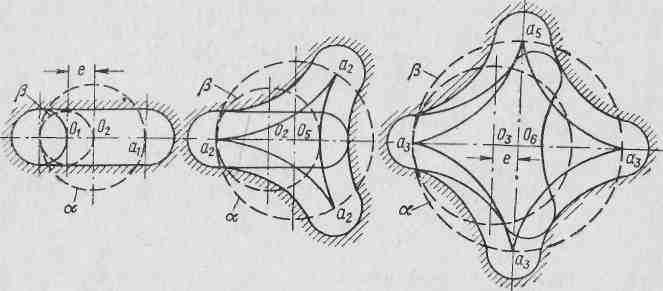 Рис. 3. Кинематика рабочих органов винтовых двигателей с различным числом заходов роторов больший создается вращающий момент. По принципу действия винтовой двигатель можно сравнить с поршневой машиной, снабженной поршнем, перемещающимся вдоль оси ротора по винтовой линии. Роль поршня выполняют отсекающие поверхности винтового ротора. В каждом поперечном сечении кинематика рабочих органов характеризуется двумя начальными окружностями (рис. 3), одна из которых, принадлежащая ротору, обкатывается внутри другой, отнесенной к статору, без скольжения с постоянной угловой скоростью. Поэтому в винтовых машинах ротор совершает планетарное движение. Смещение оси ротора относительно оси статора носит название эксцентриситета двигателя и обозначается буквой е. Однозаходный ротор не симметричен относительно центра своей начальной окружности. Поэтому сечение ротора представляет собой круг с центром а, а сечение статора — овал, симметричный относительно точки 02 с полуокружностями на концах (рис. 3). Винтовые машины с однозаходным ротором простыпо конструкции и поэтому широко применяются в различных отраслях промышленности. Возможность применения винтового двигателя для создания забойного гидравлического вращателя объясняется рядом факторов. Наиболее существенные из них: 1) отсутствие клапанных или золотниковых распределителей потока жидкости; 2) трение в паре «ротор—статор» характеризуется в основном качением, так как в точках контакта рабочих органов имеютместо мгновенные скольжения при минимальных относительных пробегах трущихся деталей; 3) непрерывное изменение положения линии контакта рабочих органов при вращении ротора позволяет потоку промывочной жидкости удалять абразивные частицы, подаваемые в камеры и шлюзы. Условия создания шлюзов в паре ротор—статор объемных винтовых двигателей следующие: 1) число зубьев или заходов статора z1 должно быть на единицу больше числа зубьев ротора z2; 2) отношение шага статора Т к шагу ротора t должно быть пропорционально отношению числа зубьев, т. е. T / t = z1 / z2