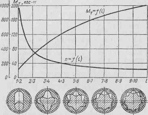 Эти условия являются необходимыми и достаточными для создания винтового двигателя. Отношение чисел зубьев ротора и статора называется кинематическим отношением механизма i = z1 / z2 Винтовую машину можно сконструировать теоретически с любым кинематическим отношением. Аналитические исследования, проведенные во ВНИИБТ, показали, что выходные параметры винтовых двигателей при различных кинематических отношениях рабочих органов существенно различаются. На рис. 4 показаны графики зависимости МT= f(i) и n = f(i) полученные для двигателя с диаметром корпуса 172мм при постоянном расходе жидкости 25 л/с и перепаде давления на шаг 10 кгс/см2. Графики показывают, что двигатели с малозаходными винтовыми механизмами развивают большие скорости вращения при минимальном вращающем моменте. По мере увеличения заходности ротора наблюдается рост вращающего момента и снижение частоты вращения. Это объясняется тем что винтовой механизм с многозаходным ротором выполняет роль двигателя и одновременно понижающего редуктора, передаточное число которого пропорционально заходности ротора.