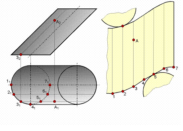 При изготовлении различных конструкций и изделий из листового материала имеет большое значение построение разверток поверхностей. Если представить себе поверхность как гибкую нерастяжимую пленку, то некоторые из них путем изгиба можно совместить с плоскостью без разрывов и деформаций. Такие поверхности относятся к развертывающимся, а полученную в результате развертывания поверхности плоскую фигуру называют разверткой этой фигуры. Те поверхности, которые нельзя совместить без разрывов и деформаций, относятся к неразвертываемым. В практике возникает необходимость изготовления из листового железа не только развертывающихся плоскостей. Теоретически точно развертываются только гранные поверхности, торсы, конические или цилиндрические поверхности. При развертывании конических и цилиндрических поверхностей общего вида в практике их аппроксимируют вписанными гранными поверхностями. В этом случае чем больше граней содержит вписанная поверхность, тем точнее ее развертка. Построенные таким образом развертки поверхностей называют приближенными. Чтобы построить развертки неразвертывающихся поверхностей, эти поверхности разбивают на части, которые можно приближенно заменить развертывающимися поверхностями. После этого строят развертки этих частей, которые в сумме дают условную развертку неразвертывающейся поверхности.