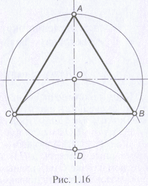 Чтобы разделить окружность на 12 частей, деление окружности на 6 частей повторяют дважды (рис. 1.17), используя в качестве центров концы взаимно перпендикулярных диаметров: точки А и G, D и J. Точки пересечения проведенных дуг с заданной окружностью разделят ее на 12 частей. Соединив построенные точки, можно получить правильный двенадцатиугольник.