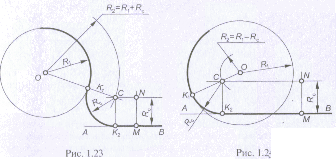 Если радиус сопряжения Rс прямой линии и окружности радиусом R задан, то при определении параметров сопряжений следует исходить из следующих положений: а) множество точек, удаленных от прямой на расстояние Rс, есть две параллельные прямые, отстоящие от заданной на расстоянии Rс; б) множество точек, удаленных от окружности на расстояние Rс, есть две концентрические окружности, радиусы которых равны сумме или разности R и Rс; в) точки пересечения множеств, указанных в пунктах «а» и «б», являются центрами сопряжений; г) точка сопряжения заданной прямой есть основание перпендикуляра, опущенного из центра сопряжения на эту прямую; д) точка сопряжения заданной окружности лежит на прямой, соединяющей центр этой окружности с центром сопряжения. По положению центра заданной окружности и центра сопрягающей дуги относительно общей касательной различают внешнее и внутреннее сопряжения. Если центр окружности и центр сопряжения лежат по разные стороны от касательной, то такое сопряжение считают внешним, а если эти центры располагаются по одну сторону от касательной, — внутренним. Рассмотрим несколько примеров. Пусть заданы окружность с радиусом R1 (рис. 1.23) и центром в точке О и прямая АВ. Требуется выполнить внешнее сопряжение радиусом Rс. Выбрав на прямой АВ произвольную точку M, восставим из нее перпендикуляр к АВ и отложим на нем отрезок МN, равный Rс.