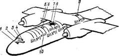 Рис. 3. Размещение основных распределительных устройств: 1 — РК кабины экипажа; 2 — щит АЗС; 3 — панель переменного тока; 4—приборная доска радиста; 5 — РК гондолы; 6 — РК переменного тока; 7, 8 — правое и левое ЦРУ; 9 — РК топливных насосов; 10 — электрощиток бортпроводника
