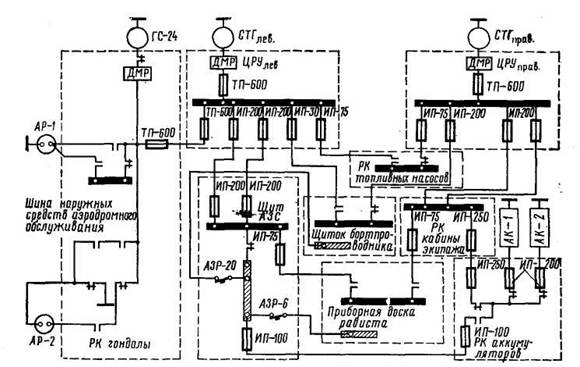 бортовые аккумуляторные батареи. Во время запуска двигателя аэродромные источники или генератор ГС-24А подключаются к шине запуска, от которой питается только якорная обмотка стартера СТГ-18ТМО. Электроэнергия подводится от источников к потребителям через распределительные устройства. В этих устройствах имеются основные и аварийные шины, к которым подключены потребители электроэнергии соответственно основной и аварийной сети. На самолете установлены следующие распределительные устройства электроэнергии постоянного тока: левое центральное распределительное устройство (ЦРУ) за откидной панелью на потолке между шпангоутами № 15 и 16; правое центральное распределительное устройство (ЦРУ) за откидной панелью на потолке между шпангоутами № 14 и 15; щит автоматов защиты сети (АЗС, рис. 2) на правом борту кабины экипажа между шпангоутами № 5 и 6; распределительная коробка «РК кабины экипажа» на правом борту между шпангоутами № 5 и 6; приборная доска радиста на перегородке шпангоута № 7 в кабине экипажа справа; распределительная коробка «РК топливных насосов» за откидной панелью на потолке между шпангоутами № 21 и 22; электрощиток бортпроводника в переднем грузовом отсеке на левом борту (между шпангоутами № 9—11); распределительная коробка «РК аккумуляторов» в переднем правом электроотсеке самолета; распределительная коробка «РК гондолы» на левом борту внутри правой гондолы. Схема расположения распределительных устройств на самолете показана на рис. 3. На рис. 4 приведена схема распределения электроэнергии постоянного тока. Основные шины имеются во всех распределительных устройствах, аварийные — в щите АЗС, за приборной доской радиста и в электрощитке бортпроводника. Основные шины всех распределительных устройств соединены между собой проводами через предохранители. Особо ответственные линии соединения дублированы, с учетом чего все основные шины вместе с проводами образуют кольцо электрической проводки.