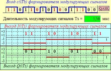 Формирователь модулирующих сигналов (ФМС) предназначен для преобразования двоичного цифрового потока от кодера C (t) в модулирующие сигналы I (t) и Q (t), которые необходимо подавать на синфазный и квадратурный входы модулятора для получения заданного сигнального созвездия на его выходе. Он должен содержать: - регистр сдвига для деления входного потока бит от кодера на группы, передаваемые одним сигналом s КАМ(t) (дибиты при QPSK и квадбиты при QASK); - преобразователи уровней битовых сигналов (униполярной кодировки в биполярную: при QPSK «0» → h, «1» → – h; при QASK «00» → 3 h, «01» → h, «10» → – h, «11» → –3 h); - дополнительно, при QASK, – кодопреобразователь исходного кода квадбит в код Грея для выравнивания минимальных расстояний между сигналами модулятора и соответствующим им квадбитам.