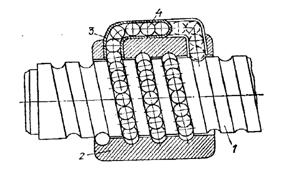 Широкое применение винтовых механизмов объясняется целым рядом их достоинств, к которым в первую очередь следует отнести: высокую надежность; большой выигрыш в силе; возможность достижения высокой точности перемещений. Винтовые механизмы (или передачи винт – гайка) служат для преобразования вращательного движения в поступательное (реже – поступательного во вращательного). Они делятся на передачи с трением скольжения и трением качения. Передачи винт – гайка с трением скольжения, несмотря на существенный недостатки (повышенный износ резьбы вследствие большого трения и низкой КПД – не более 50%), широко применяются благодаря простоте изготовления и эксплуатации, а также возможности легко осуществлять самоторможение. Производство передач этого типа хорошо освоено, по ним имеется обширный теоретический и экспериментальный материал. Конструктивно винтовые пары скольжения образуются с помощью резьб различного профиля. Резьбы того или иного вида применяются в зависимости от назначения винтовых механизмов. В скрепляющих механизмах применяют метрическую (треугольную) резьбу, как обладающую наибольшей прочностью и повышенным приведенным коэффициентом трения. Если есть опасность заедания винта, а также при ударных нагрузках используют круглую резьбу. В грузовых механизмах, предназначенных для передачи различной нагрузки (крутящего момента, осевой силы), обычно применяется трапецеидальная резьба, характеризующаяся достаточной прочностью, жестокостью и простотой изготовления. При передаче большой односторонней нагрузки используют упорную резьбу. В передаточных механизмах, которые служат для передачи движения (нагрузка при этом незначительна), применяют различные виды резьб в зависимости от непосредственного назначения механизма. Так, в механизмах подачи используют винты с многозаходной трапецеидальной резьбой, что уменьшает трение; в микрометрах – метрическую резьбу и т.д. В отличие от винтовых пар с трением скольжения, рабочие поверхности в парах с трением качения не соприкасаются. Резьба винта 1 и гайки 2 выполнена в виде канавок, по которым перекатываются шарики 4, являющиеся промежуточными телами, соединяющими винт с гайкой (рис. 1.13.). Цепь шариков замыкается с помощью специального перепускного канала 3. В процессе работы происходит непрерывная циркуляция шариков, аналогичная циркуляция шариков в шарикоподшипнике.