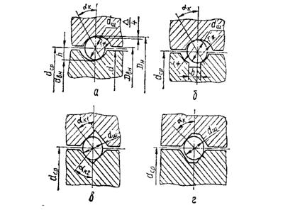 Наиболее распространен в шариковинтовых механизмах круглый профиль канавки (рис. 1.14.а). Он характеризуется наименьшими контактными напряжениями, вследствие чего требует меньшего по сравнению с другими профилями количества шариков при одинаковой грузоподъемности. Нарезка и шлифование круглого профиля не представляют каких – либо технологических трудностей. Эксплуатация таких канавок оправдана, если они защищены от загрязнения. В случае попадания на рабочую часть механизма с круглой канавкой пыли он выходит из строя быстрее, чем механизмы с другими формами канавок. Количество смазочного материала в канавке невелико из-за малых свободных объемов для его размещения. Для улучшения условий смазки иного выполняют проточки (рис. 1.14.б). При таком конструктивном решении с рабочей поверхности можно удалять абразивные частицы и пыль. Прямолинейный профиль резьбы (треугольный, трапецеидальный) (рис. 1.14.в, г) наиболее технологичен, обеспечивает постоянство угла контакта и позволяет получать трехточечный контакт между шариком и элементами резьбы винта и гайки. Однако он значительно уступает по нагрузочной способности криволинейному профилю. Допускаемая нагрузка на шарик, находящийся в канавке с профилем в виде дуги окружности, более чем в три раза превышает допускаемую нагрузку на шарик, лежащий на плоской поверхности треугольного профиля резьбы. Поэтому прямолинейный профиль резьбы применяется, как правило, в шариковинтовых механизмах, предназначенных для восприятия небольших осевых нагрузок, например в механизмах приборов. Диаметр шариков выбирается, как правило, из условий грузоподъемности винтовой пары и требований, предъявляемых к ее габаритным размерам. Обычно механизмы комплектуются шариками одинакового диаметра с разноразмерностью в пределах допуска (разность диаметров не должна превышать 3 мкм). С целью повышения нагрузочной способности, долговечности и КПД шариковинтовых механизмов диаметр шариков желательно выбирать наибольшим, так как размеры шариков оказывают значительно большее влияние на нагрузочную способность и долговечность механизмов, чем их число. Однако увеличение размеров шариков влечет за собой увеличение габаритных размеров механизма и уменьшение его кинематической чувствительности из-за возрастания инерции движущихся масс. Диаметр шарика желательно выбирать в пределах 2,5… 10 мм. Возврат шариков из конца резьбы гайки в начало достигает применением перепускного канала, вмонтированного в гайку. В некоторых редко встречающихся конструкциях перепускной канал выполняют в теле винта. В этом случае габаритные размеры передачи заметно уменьшаются, но гайку приходится делать значительно длиннее обычной, так как ход механизма определяется его длиной. Нормальная и надежная работа шариковинтовых механизмов во многом зависит от конструкции и качества изготовления перепускного канала. Давно применяющимся и вместе с тем наиболее распространенным способом является перепуск шариков посредством изогнутой трубки 3 (см. рис. 1.13), соединяющей начало и конец винтовой канавки гайки 2. Направляются шарики 4 в трубку либо непосредственно концом самой трубки, либо специальными отражателями, которые устанавливаются в корпусе гайки у концов трубки. Такие отражатели имеют закаленные выступы и выполняют