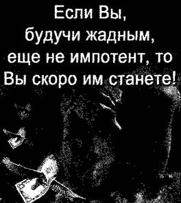 Говоря о том, что импотенцию можно излечить щедростью, можно добавить, что отдать деньги, про себя добавив - «Да хрен с ними! Берите, сволочи! Подавитесь!» - бесполезно. Это, наоборот, усугубит Ваше состояние, да и денег Вы беспутно лишитесь, потому что они, деньги не по доброму коридору пойдут, а по коридору злого отчаяния. Без денег жить еще пока нельзя. Они, деньги, играют в жизни определенную роль, чтобы, например, в этом материальном мире не иметь проблем с огурцами или кашей, которыми хочется набить все переваривающий желудок для производства... энергии, чтобы... смотреть, например, на милую статуэтку на полке, которую ты купил за бешеные деньги в грезах о любовном идеале, и на которую иногда, в период прострации, колышется что-то... чтобы, например, сиденье твоего нового шикарного автомобиля красиво изгибало твою спину, поднимая вверх... подбородок, чтобы... чтобы... чтобы... Без денег, к сожалению, нет жизни, господа! И куда от них деться, от денег-то?! Ведь в материальном мире они, деньги, представляют собой средство обмена за материальные ценности. Ведь не °Удешь же гнать три состава жевательной резинки в обмен на трактор «Чувашпиллер», - легче через банк перевести необходимую сумму денег, на которую можно купить хоть жевательную резинку, хоть арбузы, хоть... сексуальные услуги... хоть.. «Чувашпиллер»*. Деньги - это гениальное изобретение человечества. Именно они, деньги, позволяют рационально и нормально осваивать материальный мир, поднявшись выше тупого натурального обмена. Но деньги есть соблазн! Деньги опасны, очень опасны! Ведь именно через них, наш материальный мир может войти в когорту миров не под флагом Бога (как задумано Творцом), а под флагом Дьявола. Уютный и вечный человек Того Света, где нет расстояний и где все подчинено Энергии Любви, исходящей от самого Бога, направляется «на прорыв» для освоения материального** мира не только для того, чтобы и этот мир подчинялся божьим законам, но и для того, чтобы испытать почти совершенного и бессмертного человека Того Света «на вшивость», дабы вечно сохранять великолепие законов Чистой Души в родоначальном и основополагающем Том Свете, откуда начинается освоение всех миров, в том числе и нашего. Экспедицией в трехмерный мир можно назвать наше появление в этой жизни. * Огромный трактор, который изготавливают в Чувашии. Он, говорят, способен ездить.