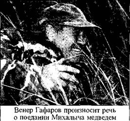 Шли мы однажды походом по Север-ному Уралу. Дождь моросил каждый день, хмарь надушу навевал. Ржавые моховые болота лежали на пути, по которым мы шли как по перине, высоко задирая ноги. Тяжелые рюкзаки мотались на спине, вдавливая нас в болото. — У-ух! - вырывалось иногда из груди кого-нибудь. Чаще всего слово «У-ух!» произносил некий Михалыч, который и во время похода старался сохранять (с дурости!) свой вегетарианский образ питания. Как-то мы скинули рюкзаки посреди мохового болота в том месте, где в диком изобилии росла голубика. Мы легли на рыжий мох и, не желая даже двигать руками, стали лежа ртом есть Iголубику. А ее, голубики, было так много... так много...Особенно жадно ел голубику Михалыч. Он просто поглощал ее, порой, по-моему, даже пережевывая стебли. — Э-эх! - промычал он однажды, ощущая радость вегетарианца, - пожить бы на этом ягодном болоте месяц или два, и есть и есть голубику, чистую голубику, в которой нет всяких там животных жиров или белков. Вот здоровье накопить можно было бы, а! — Но ты, Михалыч, был бы здесь не один, - Венер Гафаров показал на огромную кучу медвежьего помета. Михалыч как-то вдруг всполошился и глуповато-радостно сказал: — А я бы с ним подружился, с медведем-то, и мы бы с ним, медведем, паслись на этой голубичной поляне, кидая друг на друга ласковые взгляды и кушая голубику. — Паслись бы, значит? - переспросил Венер Гафаров. — Паслись бы, а чо? - проглотив очередную горсть голубики, сказал Михалыч. — Паслись бы, значит, - зловеще повторил Венер Гафаров. — Паслись бы, - гордо кивнул Михалыч, чувствуя, что Венер замышляет что-то каверзное. — Скажи, Михалыч, а ведь рано или поздно наступит осень, начнет падать снежок и... придет время медведю ложиться в берлогу? — Ну... придет такое время, - выдавил из себя Михалыч. — А как только придет это время, медведь скажет тебе, Михалыч, мирно доедающему остатки пожухшей голубики на моховом болоте, следующее: «Я съем тебя, Михалыч! Наступило время ложиться в берлогу и сосать лапу!». — Медведь такого никогда не скажет!!! Он будет моим другом! - негодующе воскликнул Михалыч. — Будет именно так, - насупился Венер Гафаров, - ему, медведю-то, запас мяса на зиму нужен... а тут ты... «друг»... пасешься на голубичной полянке. Чо не съесть-то тебя, Михалыч?! — Дружба превыше всего! - нелепо проговорил Михалыч. — Дружба дружбой, а мясо мясом! - расставил точки над «i» Венер Гафаров. — М... м... - Михалыч насупился. — Но медведь успокоит тебя, Михалыч! — Он скажет тебе: «Не расстраивайся Михалыч! Я тебя весной... выкакаю... на прекрасной брусничной полянке и ты опять будешь лежать под прекрасным весенним солнцем». — Да-а-а, - выдавил из себя Михалыч. И тут Венер Гафа-ров произнес странный монолог: — Михалыч почувствовал, что мощные челюсти медведя стали перемалывать его шейные позвонки, а вслед за ними и другие части его тела. Ощущение хруста прошло в желудке, где на Михалыча полились струи соляной кислоты, которая стала размягчать раздробленное зубами и проглоченное тело Михалыча. Противно было ощущать размягчение своего тела, пусть не цельного, но тела... в желудке этого... предателя-медведя. Дальше размягченные куски тела Михалыча перекочевали в тонкий кишечник медведя, где Михалыч вдруг почувствовал, что и без того мягкие куски его тела начали распадаться на молекулы и уходить в кровь... этого предателя, который уже, нав