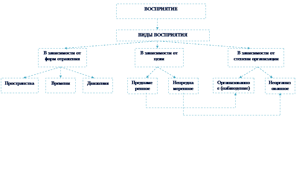 Виды восприятия. В процессе восприятия не все анализаторы играют одинаковую роль. Один из анализаторов обычно ведущий. В зависимости от того, какой анализатор играет в восприятии основную роль, различают виды восприятия. Наиболее распространены такие виды, как зрительные, слуховые, осязательные восприятия. Сложные виды восприятия представляют комбинации, сочетания различных видов восприятия. Например, восприятие учебного текста при его чтении вслух есть сочетание зрительного и слухового восприятия. Восприятие в процессе труда в школьной мастерской есть сочетание зрительного, слухового, осязательного восприятия. В зависимости от цели восприятия делятся на преднамеренные и непреднамеренные. Преднамеренное восприятие характеризуется тем, что в его основе лежит сознательно поставленная цель. Оно связано с известными волевыми усилиями человека и может существовать в форме организованного восприятия (наблюдения) – целенаправленного и планомерного восприятия предметов или явлений окружающего мира. Непреднамеренное восприятие – это такое восприятие, при котором предметы окружающей действительности воспринимаются без специально поставленной задачи, когда процесс восприятия не связан с волевыми усилиями человека. Его формой выступает неорганизованное восприятие окружающей действительности. Восприятие пространства – это восприятие объема объектов, расстояния между ними, их взаимного расположения, удаленности и направления, в котором они находятся. Оно осуществляется с помощью зрительного, тактильного и кинестетического анализаторов. Восприятия могут быть неправильными или искаженными – иллюзиями. Зрительные иллюзии – это неправильное или искаженное восприятие величины, формы и удаленности предметов. Известно много видов зрительных иллюзий. Некоторые из них: переоценка вертикальных линий (из двух линий одинакового размера вертикальная зрительно всегда воспринимается как значительно большая по сравнению с горизонтальной); неправильное восприятие величины предмета или объекта (например, высокий человек рядом с низким кажется еще выше, чем есть на самом деле). Восприятие времени – это отражение в сознании человека объективной длительности, скорости и последовательности явлений действительности. Восприятие движения – это отражение во времени изменений положения объектов или самого наблюдателя в пространстве. Наблюдая движение, прежде всего, воспринимают: характер движения (сгибание, разгибание, отталкивание, подтягивание и т.п.); форму движения (прямолинейное, криволинейное, круговое, дугообразное и т.п.); амплитуду (размах) движения (полная, неполная); направление движения (направо, налево, вверх, вниз); продолжительность движения (краткое, длительное); скорость движения (быстрое или медленное); ускорение движения (равномерное, ускоряющееся, замедляющееся, плавное, прерывистое).