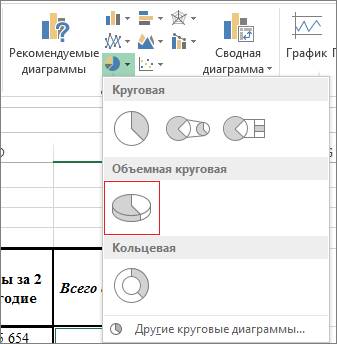 2. Вкладка Вставка – группа команд Диаграммы – Круговая – Объёмная круговая (подсказка к виду диаграммы – Отображение вклада каждого значения в общую сумму).