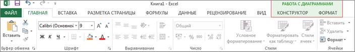 На ленте появятся контекстно-зависимые вкладки для работы с диаграммами – Конструктор, и Формат.