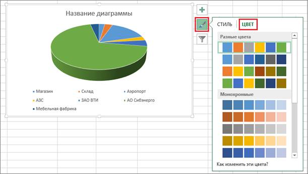 3. Если вам не нравится цветовая схема диаграммы, то изменить её можно тремя способами. Выделить диаграмму, щелкнув в области диаграммы: 1) щелкнуть по кнопке Стили диаграммы и выбрать вкладку Цвет (или вкладка Конструктор на ленте- группа команд Стили диаграмм – Изменить цвета);