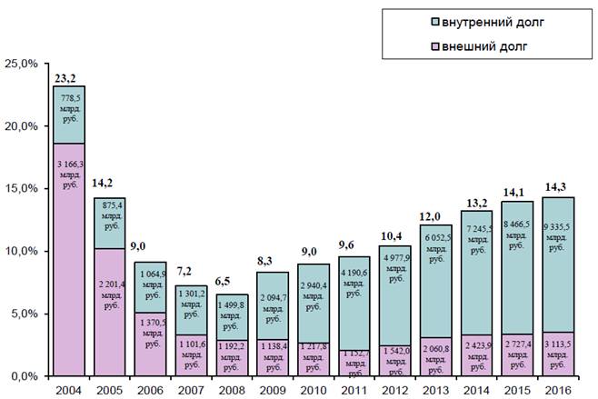 Рис. 6. Объем государственного долга Российской Федерации. [2] Важно отметить, что предельный размер государственного долга на федеральном уровне ежегодно определяется федеральным законом о федеральном бюджете. На уровне субъектов Российской Федерации и уровне муниципальных образований долг не должен превышать общий годовой объем доходов без учета безвозмездных поступлений, в определенных случаях – 50% от общего объема доходов.[3] Для проведения эффективной финансовой политики в области государственного и муниципального заимствований особое значение имеет процесс управления государственным и муниципальным долгом. Важно отметить, что Российская Федерация не несет ответственности по долговым обязательствам субъектов Российской Федерации и муниципальных образований, если такие обязательства не были гарантированы Российской Федерацией. Субъекты Российской Федерации и муниципальные образования не отвечают по долговым обязательствам друг друга, если такие обязательства не были гарантированы ими, а также по долговым обязательствам Российской Федерации. Управление государственным и муниципальным долгом предполагает использование следующих механизмов: - реструктуризация долга; - конверсия долга; - консолидация долга; - унификация долга; - отсрочка погашения долга; - аннулирование долга; - новация долга. При возникновении финансового кризиса у государства появляется необходимость проведения реструктуризации долга. Реструктуризация предполагает прекращение долговых обязательств с их заменой на новые долговые обязательства, предусматривающие другие условия обслуживания и погашения. Реструктуризация может проводиться с частичным списанием размера долга. Конверсия государственного долга предполагает изменение доходности займов в форме повышения или снижения процентов по займам. В ходе консолидации государственного и муниципального долга происходит изменение срока действия ценных бумаг (долга). При унификации государственного долга происходит объединение нескольких займов в один. При этом облигации равнее выпущенных займов обмениваются на облигации нового займа. При отсрочке погашения наряду с отсрочкой погашения самого займа временно прекращается выплата процентов по нему. Аннулирование государственного долга означает отказ государства от обязательств по выпущенным займам. Причинами аннулирования долга могут быть финансовая несостоятельность (банкротство) государства или приход к власти новых политических сил, отказывающихся принять обязательства предыдущих властей. Наконец, новация государственного долга означает, что обязательства прекращаются соглашением сторон о замене первоначального обязательства другим обязательством между теми же лицами, предполагающими другой предмет и способ исполнения обязательств. Date: 2015-07-23; view: 907; Нарушение авторских прав |