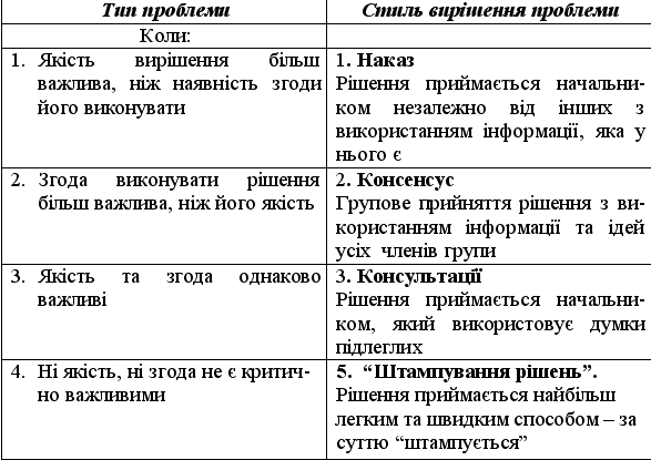 Коли критичним фактором є час, рішення повинно бути прийнято індивідуально у формі наказу. Менеджер самостійно приймає рішення та повідомляє підлеглим про його зміст. Коли час не є критичним фактором, необхідно прийняти до уваги наступний фактор – ступінь довіри менеджера до підлеглих: - якщо він є достатньо високим, менеджер може використати стиль “консультації”, тобто демонструвати зацікавленість у думках підлеглих щодо вирішення проблеми; - якщо ступінь довіри є низьким, тоді необхідно брати до уваги відразу два наступні фактори: потрібної якості рішення і ступеня згоди підлеглих виконувати рішення. Механізм вибору стилю прийняття рішення у цьому випадку описаний в табл.2.1. Таблиця 2.1. Вплив типу проблеми на вибір стилю прийняття рішення Тип проблеми Стиль вирішення проблеми Коли: 1. Якість вирішення більш важлива, ніж наявність згоди його виконувати 1. НаказРішення приймається начальни-ком незалежно від інших з використанням інформації, яка у нього є 2. Згода виконувати рішення більш важлива, ніж його якість 2. КонсенсусГрупове прийняття рішення з ви-користанням інформації та ідей усіх членів групи 3. Якість та згода однаково важливі 3. КонсультаціїРішення приймається начальни-ком, який використовує думки підлеглих 4. Ні якість, ні згода не є критич-но важливими 5. “Штампування рішень”. Рішення приймається найбільш легким та швидким способом – за суттю “штампується”