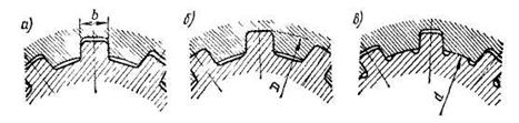 По форме профиля шлицев различают три типа соединений: прямобочные, эвольвентные, треугольные. Соединения с прямобочными зубьями выполняют с центрированием по боковым граням зубьев (рис. 11.13, а), по наружному (рис. 11.13, б) или внутреннему (рис. 11.13, в) диаметрам вала. Рис. 11.12. Стандартом предусмотрены три серии соединений (легкая, средняя и тяжелая), которые отличаются высотой и количеством зубьев. Число зубьев изменяется от 6...20. У соединений тяжелой серии зубья выше, а их количество больше, чем у соединений средней и легкой серий. При выборе способа центрирования руководствуются следующим.