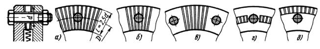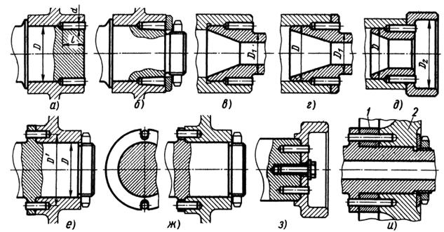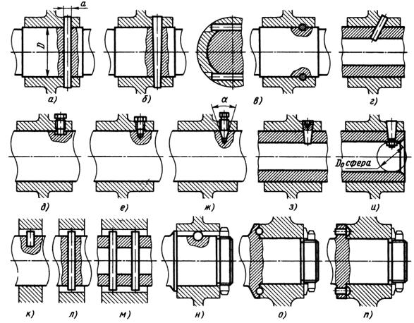 Вследствие благоприятной формы выемок в валу и ступице концентрация напряжений относительно невелика. Многоштифтовые соединения этого типа по прочности приближаются к шлицевым, а при прессовой посадке по центрирующим поверхностям могут превосходить их. Недостаток соединения — необходимость совместной обработки отверстий под штифты в валу и ступице. Материал детали и вала должен быть примерно одинаковой твердости, в противном случае неизбежен уход сверла в сторону более мягкого металла. Соединения осевыми штифтами применимы для крепления насадных деталей в концевых установках при не слишком большой длине вала, когда обеспечен удобный подвод сверл и разверток к торцу вала. Этим способом можно крепить детали и во внутреннем отверстии вала при условии, если деталь не слишком длинна и наружный диаметр D1 детали меньше (виды в, г) или внутренний диаметр D2 больше (вид д) диаметра D посадочной поверхности. Положительная особенность конструкций г и д заключается в том, что сверло получает хорошее первоначальное направление в стенке детали. В разборных соединениях штифты запрессовывают в ступицу (виды е, ж) или торец вала (вид з); свободные концы штифтов входят на посадках h6 или js6 соответственно в отверстия вала или ступицы. Допустимо крепление деталей разной твердости. Соединение более технологичное, чем первое (возможна раздельная обработка вала и детали по кондукторам), но менее прочное. На виде и показано крепление на штифтах деталей 1 и 2 к валу. Штифты установлены на прессовой посадке в детали 1 с длинным отверстием и входят на центрирующей посадке в бурт вала и вторую насадную деталь. Передаваемый осевыми штифтами крутящий момент