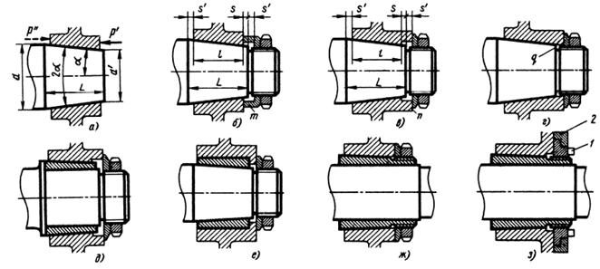 Рис. 11.23. Конусные соединения Прессовые конусные соединения (рис. 11.23, а) применяют в глухих и редко разбираемых соединениях, затяжные (рис. 11.23, б, в) — в разборных. Конические поверхности вала и ступицы обрабатывают, как правило, по 7-му квалитету точности, параметры шероховатости Ra = 0,32 — 1,25 мкм. В ответственных разборных соединениях конусы притирают по краске до получения контакта на площади не менее 80% поверхности конуса. Для облегчения притирки и повторных переборок целесообразно выпускать конус вала из отверстия ступицы на величину s = 1,4 - 2 мм (виды б, в). Иначе на стенках отверстия в точках q (вид г) при притирке образуется кольцевая ступенька, затрудняющая перемещение ступицы вдоль вала. Свешивающуюся часть конуса перекрывают чашечной шайбой m (вид б) или кольцевым выступом п на ступице (вид в) с запасом s' на осевое перемещение ступицы при затяжке. Учитывая возможность смятия посадочных поверхностей в эксплуатации, запас делают равным (1,5—2)h, где h — расчетное осевое перемещение втулки при первоначальной затяжке. Резьба вала также должна быть выполнена с запасом s'. Во избежание уменьшения рабочей длины соединения при переборках противоположный конец конуса должен выходить за ступицу на величину не менее s'. Таким образом, длина конуса вала должна быть равна L = l + s + s' (l - длина рабочей поверхности ступицы). В соединениях, подвергающихся циклическим нагрузкам, во избежание наклепа и сваривания посадочных поверхностей вводят промежуточные втулки из твердых бронз (БрКМц-3-1 или БрБ2) с наружной (рис. 11.23, д) или внутренней (вид е) конусностью. Центрирование происходит по двум поверхностям, что предъявляет повышенные требования к точности изготовления втулок. Целесообразнее применять гальваническое или термодиффузионное покрытие контактных поверхностей мягкими металлами (Сu, Zn). Такие покрытия не только предотвращают сваривание, но и значительно повышают несущую способность соединения. При установке деталей на длинных валах, а также при необходимости регулирования в широких пределах осевого положения деталей на валу применяют затяжные втулки (вид ж, з). В конструкции з предусмотрено съемное устройство. При отвертывании гайка 1, упираясь ребордой в шайбу 2, привернутую к ступице, стягивает ступицу с вала.