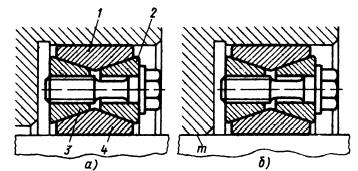 Рис. 11.24 11.6 Соединения коническими затяжными кольцами Вэтих соединениях крутящий момент передается коническими кольцами, устанавливаемыми в кольцевом зазоре между валом и ступицей и затягиваемыми гайкой на валу (рис. 11.25, а) или в ступице (вид б). Кольца, надвигаясь при затяжке своими коническими поверхностями одно на другое, упруго деформируются: наружные (охватывающие) разжимаются, а внутренние (охватываемые) сжимаются, вследствие чего на поверхности вала и отверстия возникает натяг.