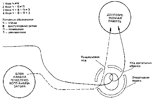 На рис. 19 показана условная модель преобразований, происходящих в структуре умственных действий при выполнении упражнения с выстукиванием ритма. Как показано на рис. 19, обработка информации при чтении возможна в принципе двумя способами. Первый способ осуществляется с участием блока канала речеслухового анализатора (на рисунке изображен пунктиром). Это чтение с ярко выраженной артикуляцией. Как происходит дальнейшая обработка информации в таком режиме чтения, показано на схеме.