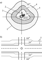 Рис. 2.4. Построение зон индивидуального риска для опасного предприятия (а) и транспортной магистрали (б), по которой осуществляется перевозка опасных грузов: 1 – изолинии равного риска; 2, 3, 4, 5 – зона соответственно чрезвычайно высокого, высокого, приемлемого и низкого риска Максимальным приемлемым уровнем риска для экосистем считается тот, при котором может пострадать 5% видов биогеоценоза. Два конкретных примера того, как работают такие нормы на практике. Голландская компания "GeneraL ELectric PLastics" обратилась за разрешением на расширение производства на одном из своих заводов. На этот завод по железной дороге привозилось примерно 600 т хлора в неделю, а в качестве промежуточного реактива использовался фосген. Жители расположенного в 600 м поселка возражали против такого разрешения, поскольку боялись увеличения риска катастрофы. Эксперты провели расчет, и оказалось, что вклад фосгена в общий риск, создаваемый заводом, совсем не велик. Зато расширение завода неминуемо приводило к увеличению объемов хранения и перегрузки хлора, в результате чего значительная часть поселка могла оказаться в зоне, где риск превышал 10-. Из этой ситуации был найден довольно неожиданный выход: чтобы сделать завод более безопасным, требовалось не просто расширить его, но и начать собственное производство хлора. Тогда исчезла бы угроза, связанная с перевозкой и хранением этого ядовитого газа, и общая безопасность предприятия даже возросла бы. Такой выход устроил и местные власти, и руководителей компании. Другой случай произошел на юго-востоке Голландии, где расположено крупное химическое предприятие, выпускающее среди прочего до полумиллиона тонн аммиака и акрилонитрита в год и отстоящее от ближайших поселков всего на 200 м. Когда местные власти предложили план застройки местности между поселком и предприятием, по существующим правилам был проведен анализ уровня риска в этой зоне. На территории завода находилось около 35 различных объектов, 10 из которых вносили главный вклад в общую угрозу. Каждый из них был тщательно изучен. Неожиданно обнаружилось, что многие считавшиеся раньше весьма опасными установки на самом деле не играют той роли, которую им приписывали. Зато недооценивалась опасность, связанная с хранилищами аммиака. Выяснилось, что часть новой застройки попадает в зону с высоким уровнем риска. Эксперты дали две рекомендации: руководству завода принять меры по снижению риска, местным властям ограничить строительство на территориях, примыкающих к заводу. Жители поселков с энтузиазмом приняли первую часть рекомендаций и с негодованием - вторую. После обсуждения в парламенте было решено в этот раз позволить строительство в зоне, где риск не превышает 10-, но в будущем ориентироваться на линию, на которой риск составляет 10-, то есть пренебрежимо мал. Специалисты из разных стран спорят о том, насколько правильны и объективны используемые в Нидерландах методы расчета, насколько точны их карты, насколько оправдан поиск компромисса между выгодой и безопасностью. Рядовым жителям - неспециалистам, судить об этом трудно. Зато они чувствуют, что государство не на словах, а на деле заботиться об их жизни, так что они могут доверять самому подходу к проблеме - честному и действенному. Конечно, Нидерланды надо рассматривать как пример страны, где наиболее ш